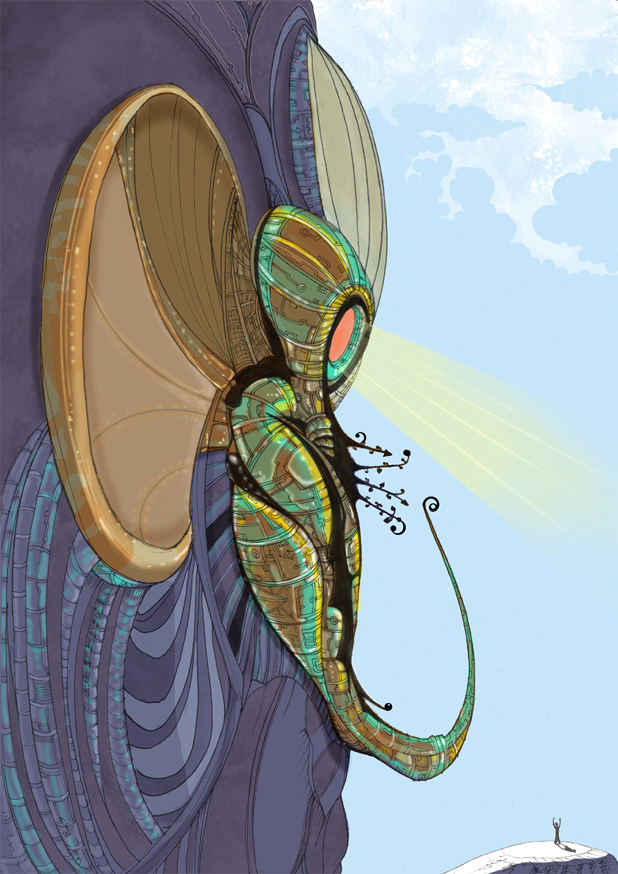 Mein Overpaint ist naturlich nicht besonders innovativ, ich habe z.B. die Farbe ja groessenteils eliminiert, es ging mir nur um die Beleuchtung durch haertere Kontraste und Schatten und Verlauufe. Wenn du deine Bilder mal in Graustufen umwandelst, siehst du, dass du Tonwerte weitgehend nicht nutzt, um deine Objekte zu modellieren. |